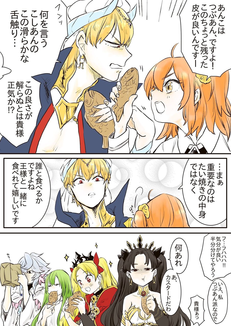 お題箱より、たい焼きの中身がつぶあん派かこしあん派で喧嘩してるキャスギルとぐだ子。聖杯戦争ばりの喧嘩の方が良かったでしょうか、生温い喧嘩となりました。最近はいろんなたい焼きの中身があって素晴らしい世界ですな。楽しいお題有難うござい… https://t.co/Zz87XUEGsK