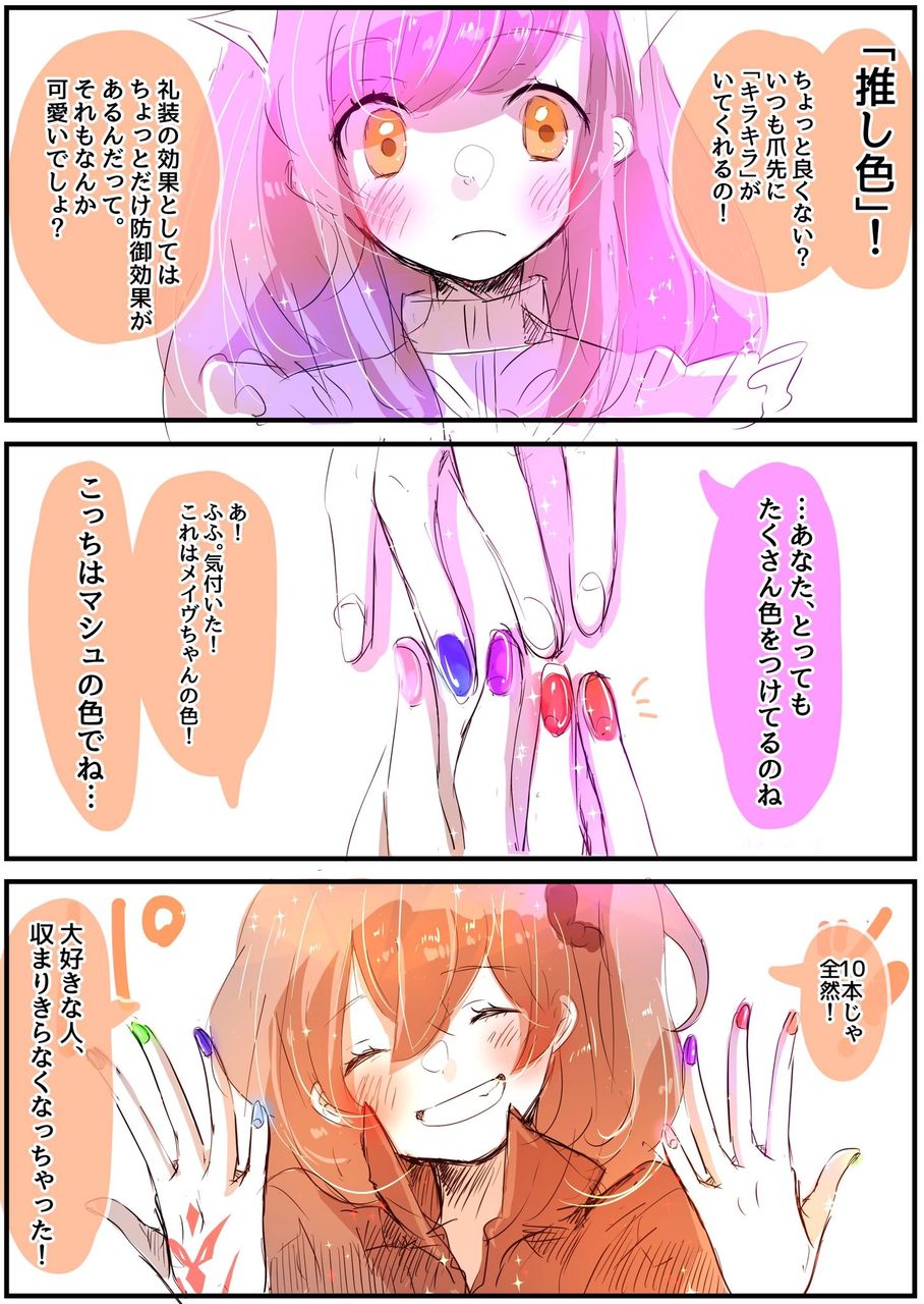 @0550gerichan リツカの笑顔もメイヴちゃんの笑顔もめちゃくちゃいいです…爪に描ける笑顔になる魔法すごい良いですね…この後クー・フーリンにも軽い足取りで見せに行くってジャーン!って感じで見せてる所が想像できます可愛い…