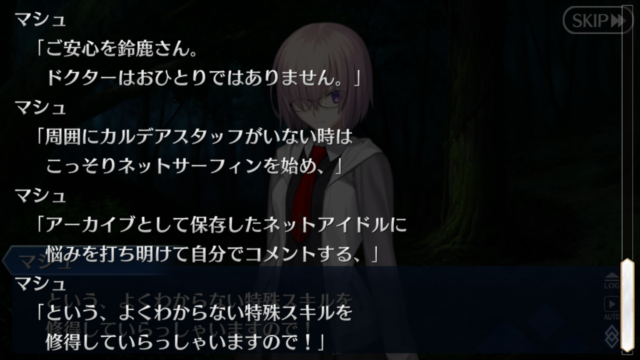 鈴鹿の幕間、マシュ含めて全員の喋り方がぎこちなさすぎるから外部ライター丸出しすぎて楽しめんわ