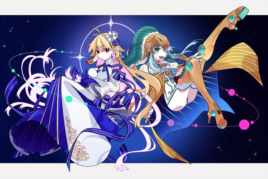 めっちゃ可愛いです!!!後ろの背景の宇宙空間のグラデきれいだし二人の周りに回ってる星?も二人を囲んでる感じがして神秘的だし美しくて可愛いです!!
